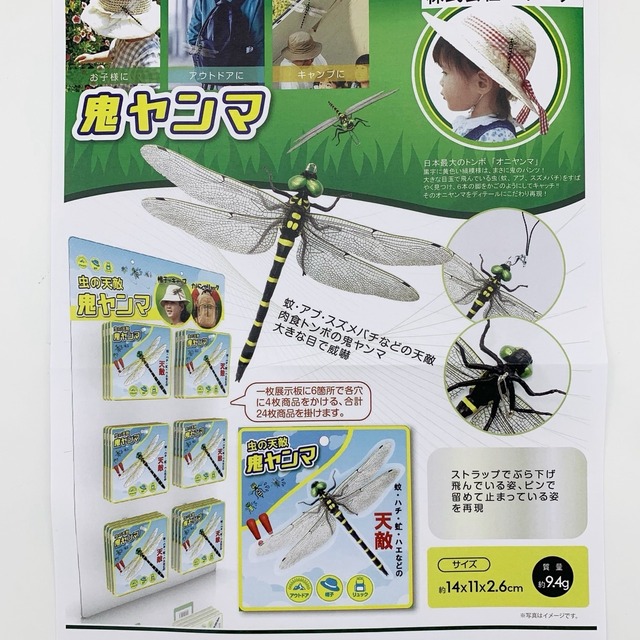 【鬼ヤンマ - 自然派の虫よけアイテム】 強そうな見た目で人気の「鬼ヤンマ」をモチーフにした虫よけアイテム。 実は、鬼ヤンマは昆虫界のハンターとして知られ、多くの虫たちが本能的に近寄らないとも言われています。 この習性をいかして、鬼ヤンマをバッグや帽子、ランドセルに取り付けて、自然な虫よけアイテムとしてご活用いただけます。 *ストラップでぶら下げて飛んでる姿、ピンで留めて止まっている姿、どちらもで使用できます。 ・キャンプやハイキング、通学時のお守りに ・外遊びが多いお子様にもおすすめ ・昆虫好きへのギフトにもぴったり 【サイズ】約14X11X2.6cm 【重量】約9.4g